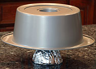 To cool after baking, rest cake upside-down on a funnel inserted into cake pan hole (if funnel is plastic, coat with aluminum foil to prevent heat damage). A bottle with a thin neck may also be used.