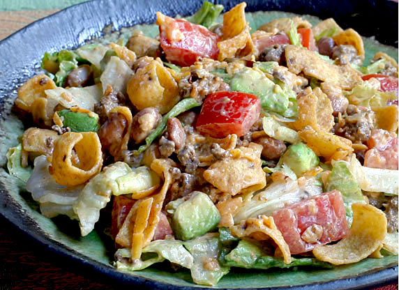 cheddar cheese, corn chips, tomato chunks, pinto beans and avocado (optional). These tasty ingredients are tossed together with some Thousand Island dressing, giving this salad the perfect flavor zing!